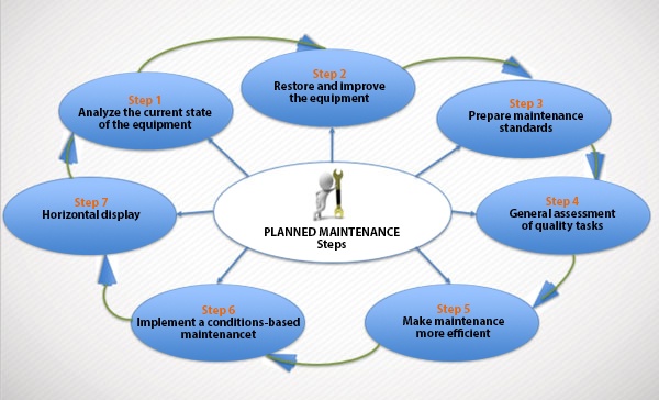 Now, there is more than this in order to achieve Zero Breakdowns. We must also correctly implement a Planned Maintenance system. We can do it by following the 7 Steps for Planned Maintenance since, in order to implement a Planned Maintenance System, we must carefully and previously plan and prepare it all. I recommend applying these steps according to the sequence proposed here and with the cooperation of the pillars involved.
